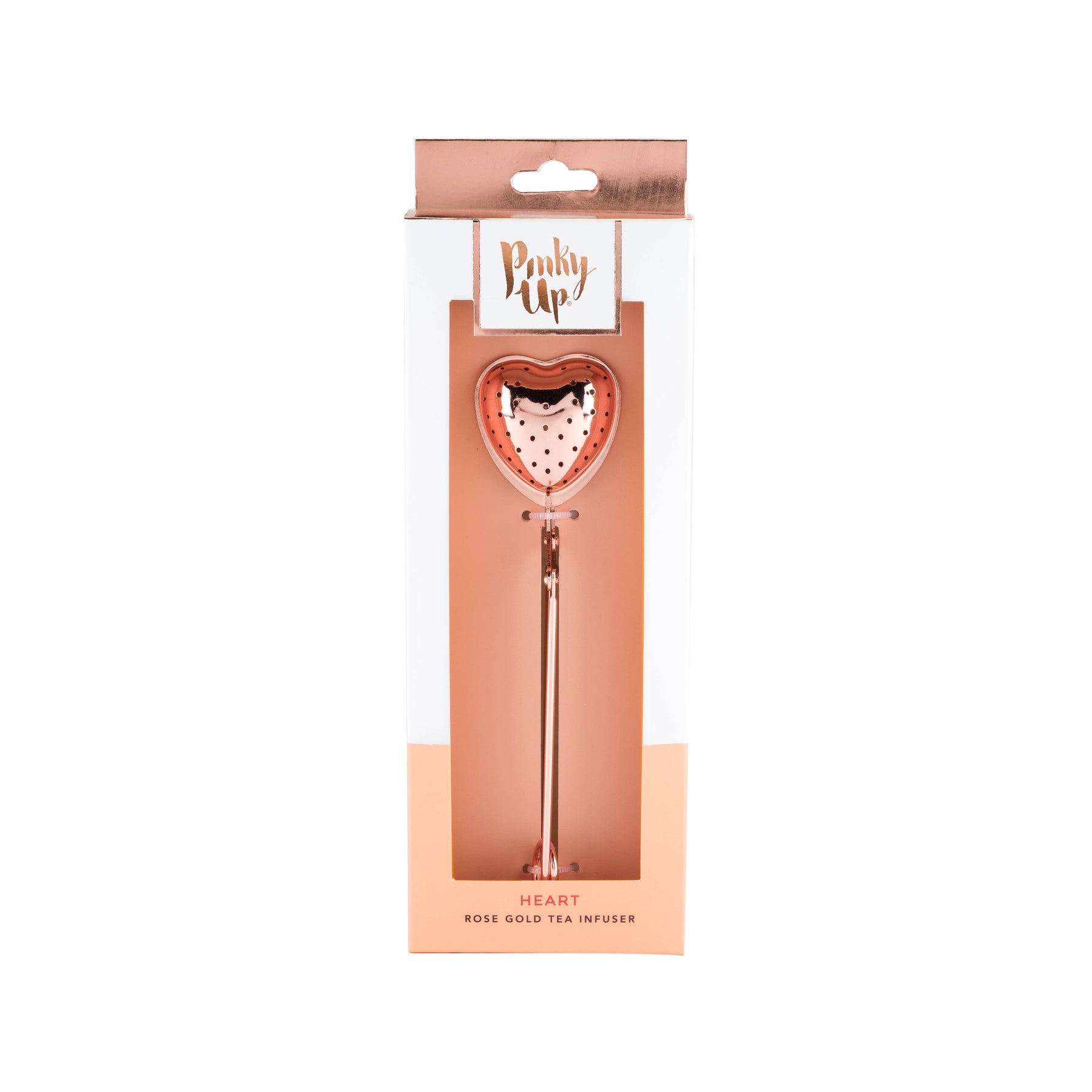 Make your next cup of tea even more heartwarming with the Rose Gold Heart Shaped Tea Infuser by Pinky Up. Tea strainers are a fantastic way to infuse your favorite loose leaf flavors. Now you can enjoy a heartfelt version of the iconic tea accessory that doubles as a stir stick. Material: Food-safe stainless steel Finish: Rose gold Use: Joint clasp keeps tea contained, Doubles as a stir stick Care: Hand wash