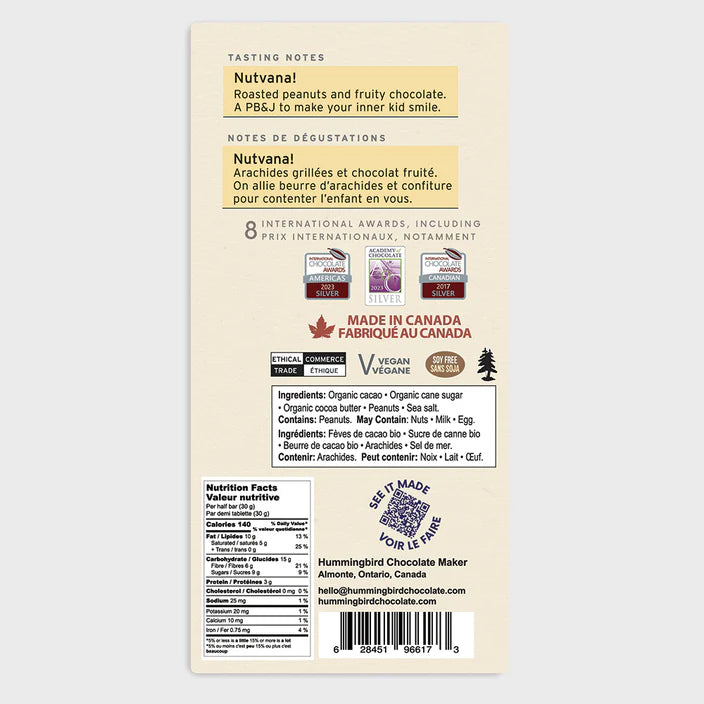 Ingredients: Organic cacao, organic cane sugar, peanuts, organic cocoa butter, sea salt.