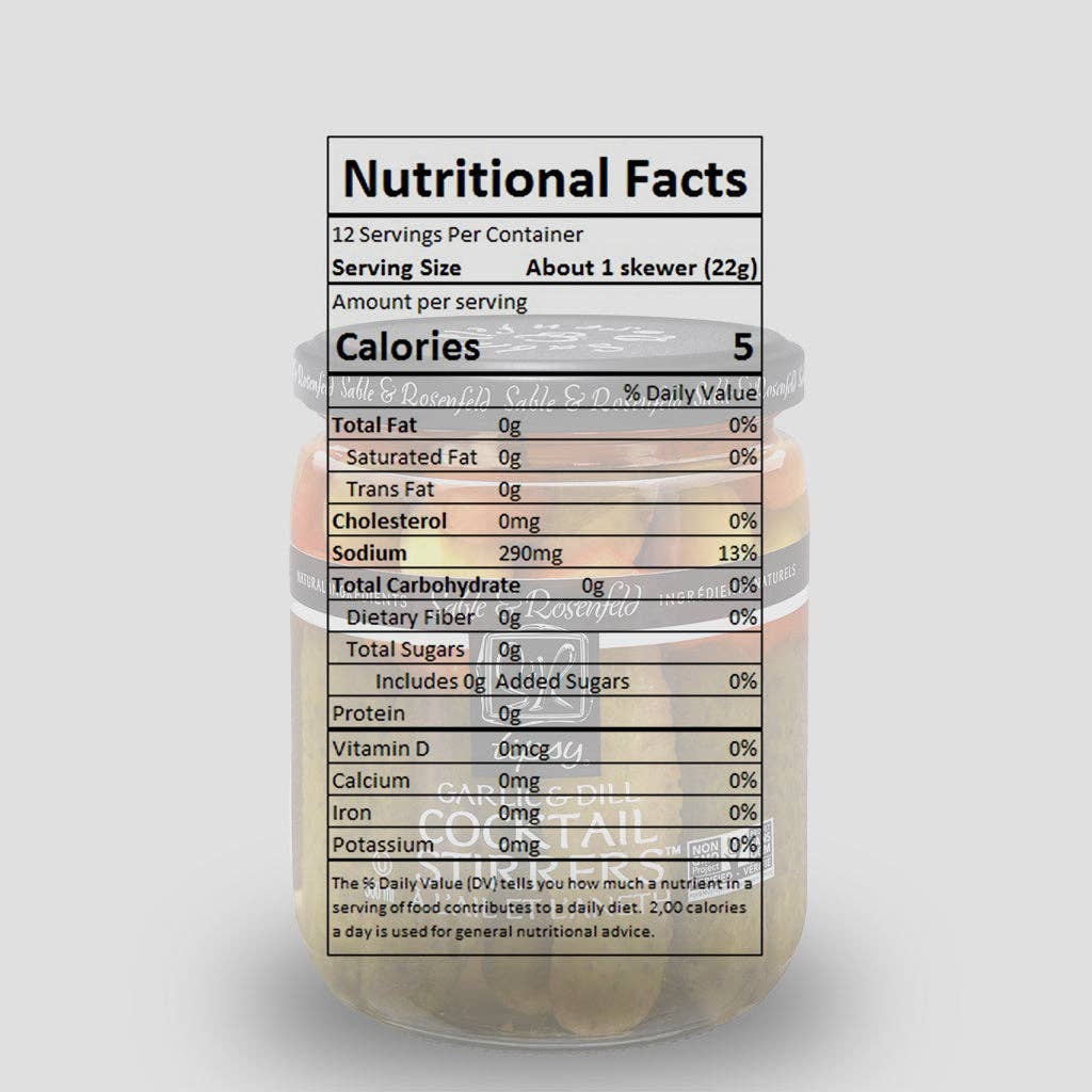 Each hand-packed skewer is made up of a crunchy pickle, green olive, a slice of red bell pepper and a sliver of carrot bathed in a subtle brine with just a hint of garlic and dill. Impress your guest with this unique garnish in Bloody Marys, Caesars, Martinis, or your favourite cocktail.