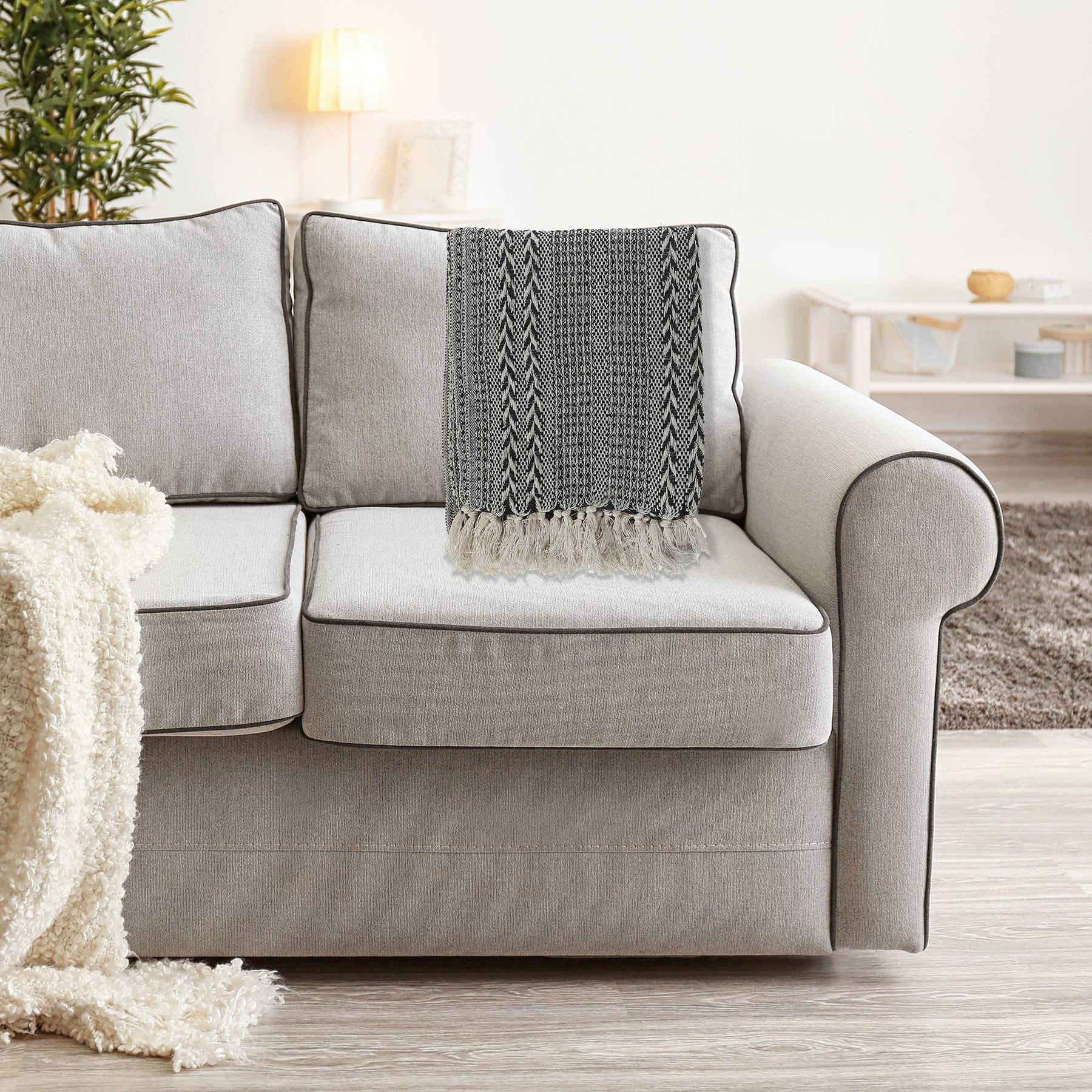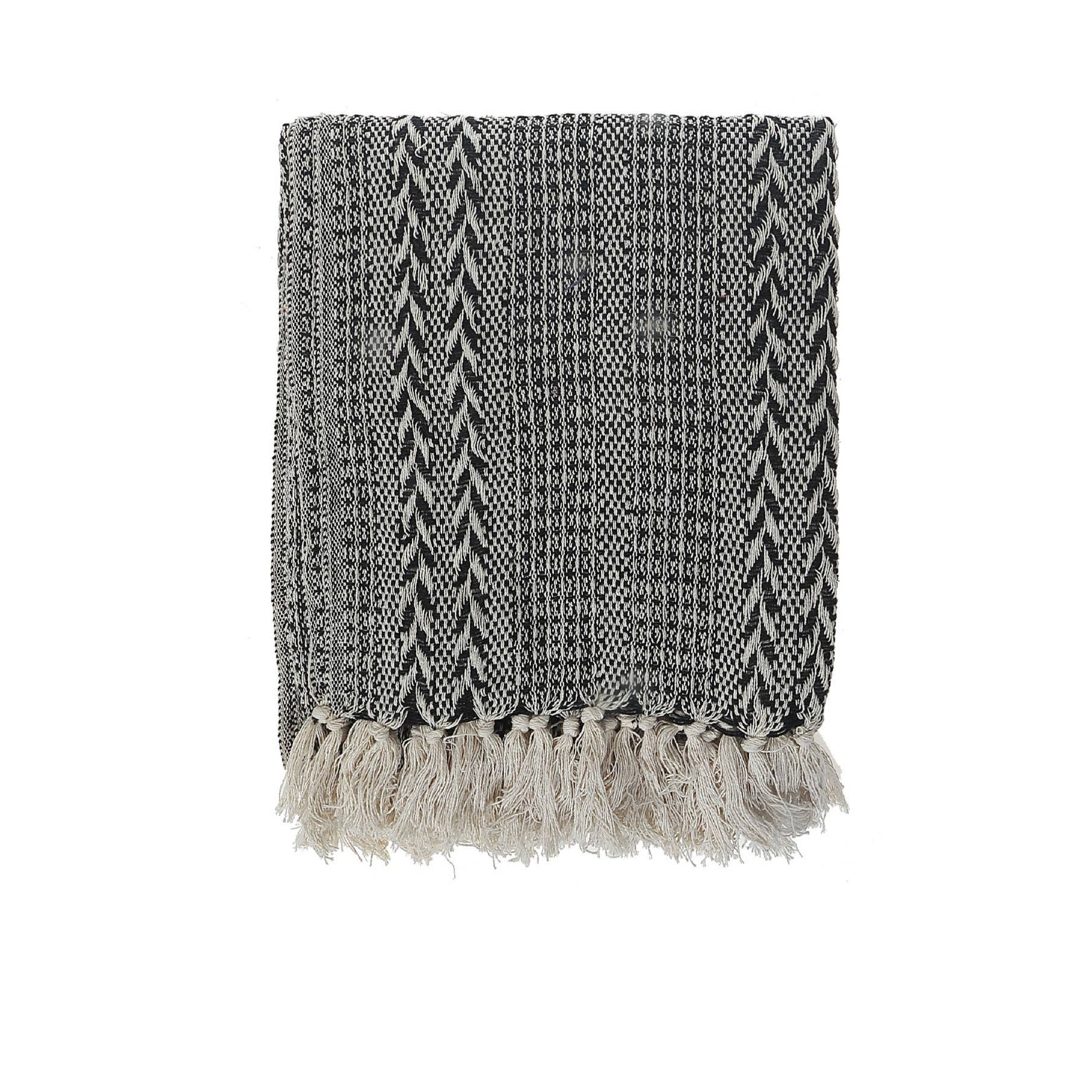 A perfect accent for your sofa, bed, or favorite chair, the Black Braided Cotton Throw with Fringes brings a warm and inviting vibe to your space. This black cotton throw features an intricate braided design that adds warmth and texture to any space, complemented by soft fringes for a dramatic look. Its bold black hue blends effortlessly with various interior styles. Features: The classic braided pattern in a black tone brings texture and charm, while the fringe detailing adds a stylish, cozy touch. Material: Made from 100% cotton, this fringe throw ensures a soft, breathable feel that makes it ideal for year-round use. Dimensions: Sold as a set of 1 piece, this braided throw is 50" X 60" in inches.