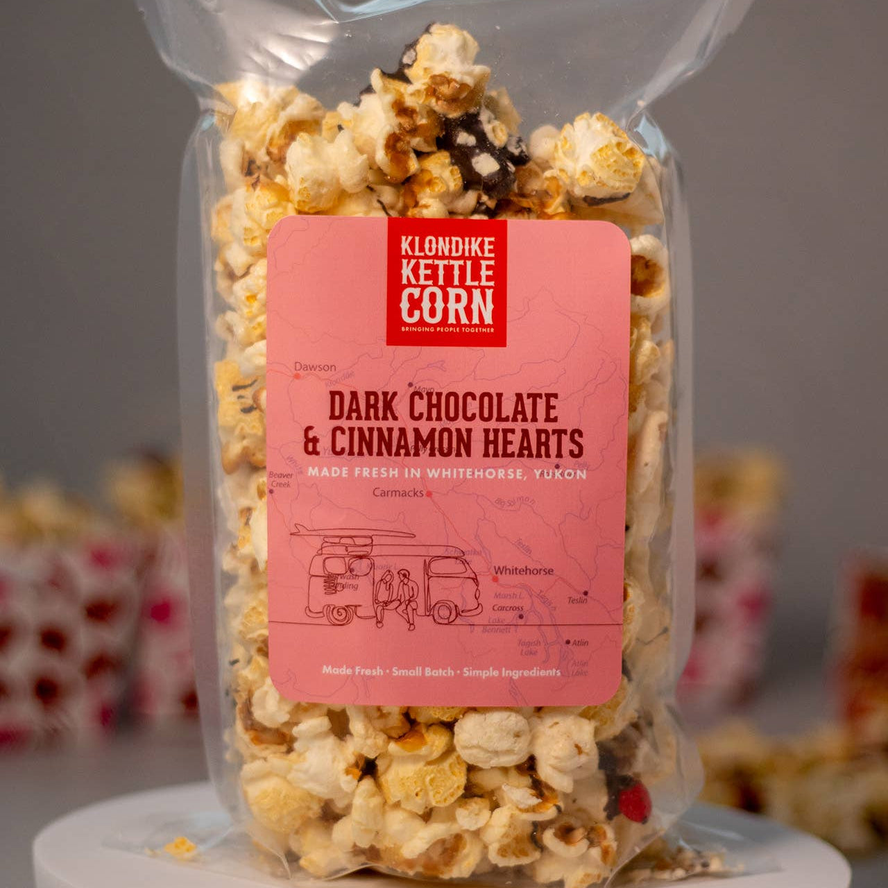 - 🍁Dark Chocolate & Cinnamon Hearts Popcorn // Klondike Kettle Corn: Sweet-and-salty kettle corn is drizzled with rich chocolate and topped with festive cinnamon hearts